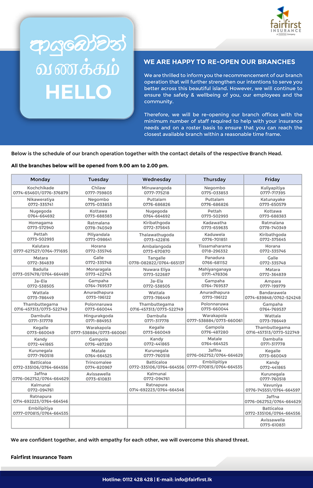 We are thrilled to inform you the recommencement of our branch operation that will further strengthen our intentions to serve you. We will be re-opening our branch offices with the minimum number of staff required to help with your insurance needs.