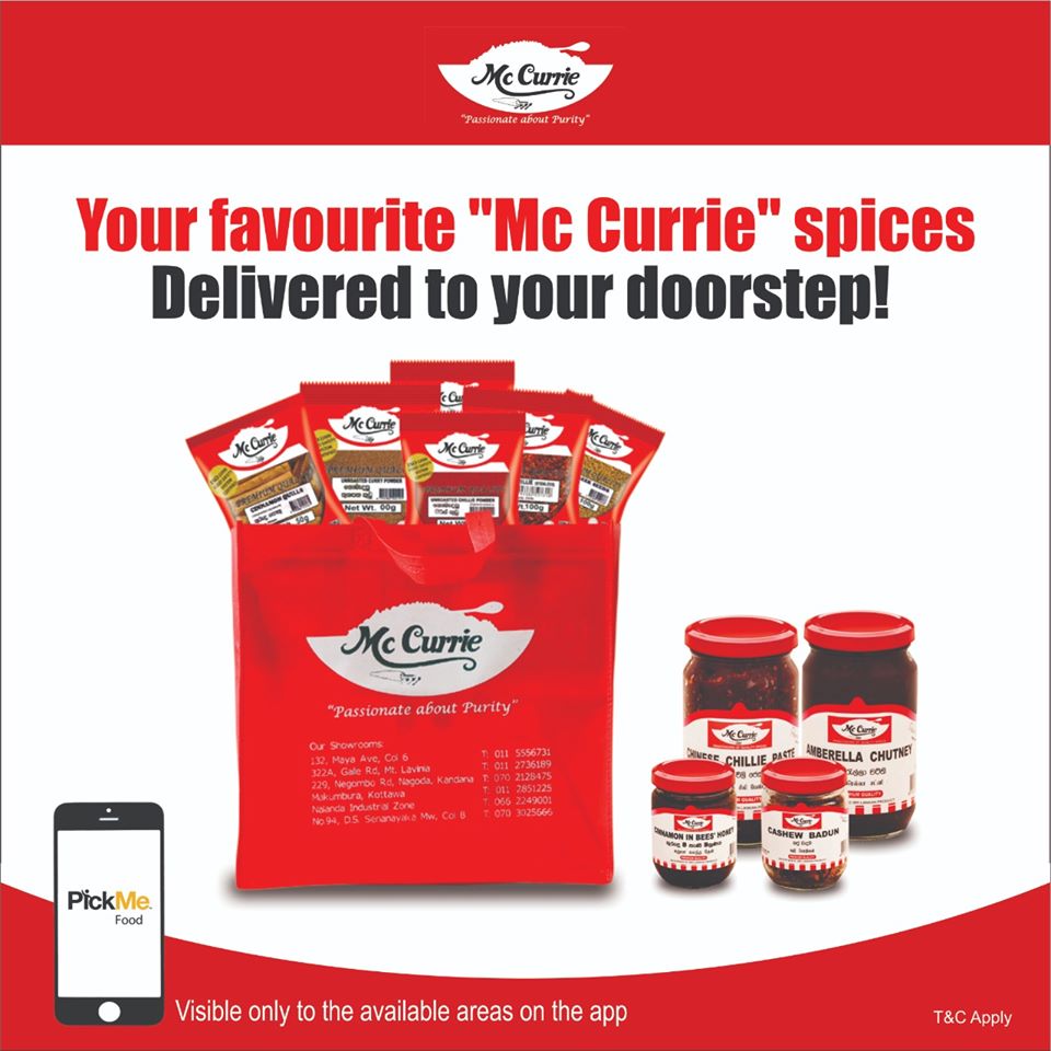 We, “Mc Currie” have joined hands with Pick Me, so that you could have an uninterrupted supply of your favourite “Mc Currie” products. Log into your Pick me app to check whether your location is on. All you got to do is log in and search for “Mc Currie”